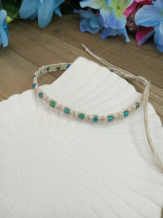 Classic Beaded Anklet - Natural Hemp - Blue-Green Beads