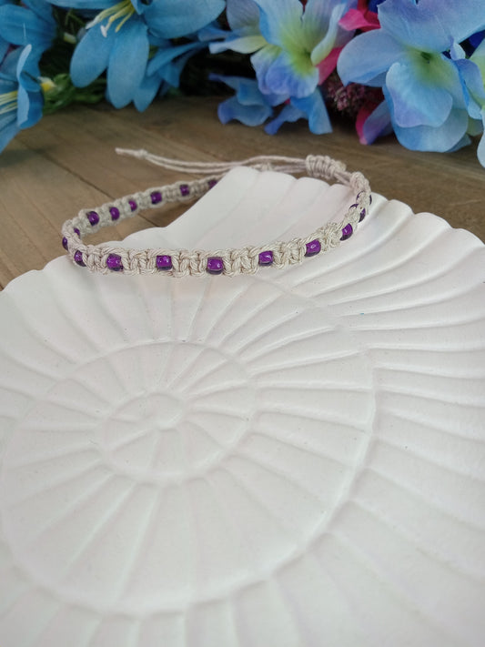 Classic Beaded Anklet - Natural Hemp - Purple Beads