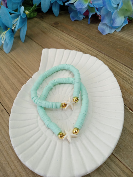 Clay Bead Bracelet - Seafoam Green with White Starfish